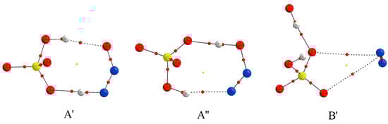 The optimized neutral complexes (A) and (B) and their molecular graphs, where the units of the bond distances and angles in parentheses are in angstroms and degrees, respectively. The bond critical point (BCP) is denoted as a small red dot.