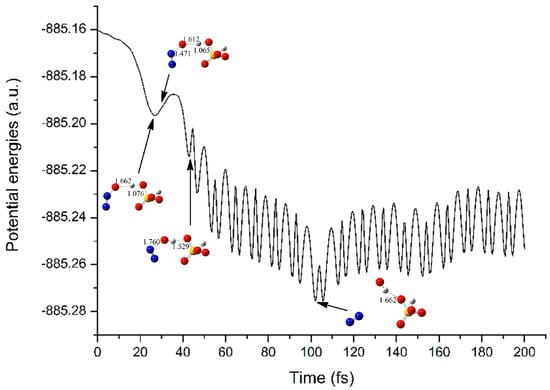 As shown in Figure 11 and Figure S2 of Supplementary Materials, for complex A upon electron capture, H2SO4 and N2O begin to approach to each other, accompanying with the strengthening of the intermolecular H-bond. Meanwhile, the O4-H5 bond participating in the H-bond in H2SO4 fragment increases gradually. On the contrary, the distance between the terminal N10 atom of N2O and the H5 atom of H2SO4 fragment decreases simultaneously. As a result, the H5 atom of H2SO4 fragment has been transferred to the terminal N10 atom of N2O fragment. For example, at 88.5 fs, the distances N10···H5 and O4···H5 have been changed from the initial 2.030 and 0.974 A to 0.981 and 1.699 A, respectively. At 134.5 fs, the H5 atom of H2SO4 has been transferred to the N10 atom of N2O, producing the HNNO and HSO4− fragments, which is consistent with the optimized complex A′.