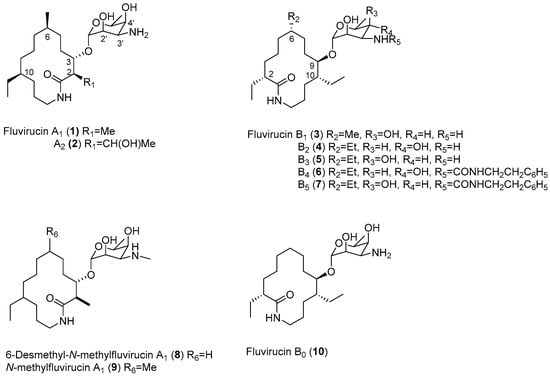 Fluvirucins, a class of macrolactam alkaloids, including fluvirucin A1-2 and B1-5 (1–7) (Figure 1) were isolated in the 1990s [1,2,3,4,5,6]. These macrolactam antibiotics have drawn significant attention due to their considerable inhibitory activities against the influenza A virus in Madin—Darby canine kidney (MDCK) cells [3,4]. They commonly consist of 2,6-dialkyl-10-ethyl-3(or 9)-hydroxy-13-tridecanelactam as an aglycon called fluvirucinine, which possesses four stereogenic centers and is connected to a carbohydrate by a glycosidic linkage. The synthesis of fluvirucinines has continuously attracted the attention of organic chemists [7,8,9,10,11,12,13,14,15] due to the difficult stereocontrol during the creation of distant stereogenic centers. Recently, three new macrolactams, including 6-desmethyl-N-methylfluvirucin A1 (8), N-methylfluvirucin A1 (9), and fluvirucin B0 (10), were isolated from Nonomuraea terkmeniaca MA7364 [16] and Nonomuraea terkmeniaca MA7381 [17], respectively. In particular, 6-desmethyl-N-methylfluvirucin A1 (8) exhibited in vitro activity (EC90 15 ± 5 μg/mL) against Haemonchus contortus larvae. The absolute configurations of C2, C3, and C10 of 8 and 9 have not been determined yet, although the relative stereochemistry of C2 and C3 has been disclosed. The stereochemistries of C2, C3, and C10 of 8 and 9 have been considered the same as those reported for the fluvirucin A series [16].