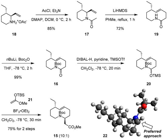 Our synthesis was commenced with the preparation of azacycle 17, which is the first ACR precursor, through the acetylation of the known and optically active vinylpiperidine 18 [14], as shown in Scheme 2. The subjection of 17 to the first ACR (LiHMDS, toluene, reflux) [14,15,21,22,23,24] produced the ring-expanded lactam 19 with a 72% yield. Our initial attempt for the amidoallylation of 19, which was commonly utilized to prepare a second ACR precursor in our previous syntheses [15,23,30,31,32,33], was not successful. We encountered difficult diastereocontrol in the amidoallylation of 19, which was likely due to the absence of the 2-methyl substituent [15]. We anticipated that the ring-olefin in a medium sized-lactam system can induce an intrinsic ring strain that results in an improved diastereoselective amidoalkylation. In addition, we decided to execute an amidoalkylation with ketene acetal 21 as a bulky nucleophile [34]. After the Boc-protection of lactam 19, the resulting lactam 16 was subjected to a sequence [15,23,30,31,32,33,34] of DIBAL-H reduction followed by the trapping of the resulting alkoxide with TMSOTf and the addition of ketene acetal 21 to the unstable N,O-acetal TMS-ether 20 in the presence of BF3∙OEt2. Indeed, a highly diastereoselective amidoalkylation of 16 was observed, which afforded methyl ester 15 with a 75% yield for three steps and a small amount of diastereoisomer (10:1). The excellent diastereoselectivity was likely due to the sterically favored Si-face attack of the bulky ketene acetal 21 in the energetically favorable (Z)-N-acyl iminium intermediate 22 that was generated from N,O-acetal TMS ether 20 [34,35].