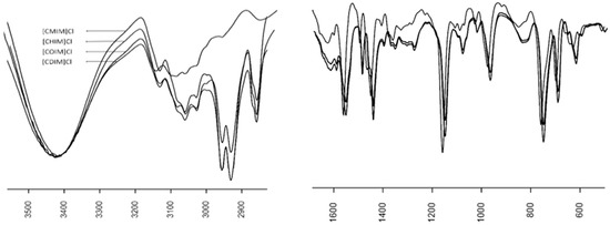 IR spectra (Figure 1) for all synthesized N-cinnamylimidazolium salts showed a band at 3300–3600 cm−1 assigned to the bending and stretching modes of absorbed water, stretching absorption bands at 3100–3060 cm−1, 2960–2930 cm−1 [16], 1630–1570 cm−1 [17] and 1289–774 cm−1 attributed to (C-H) Aromatic, (C-H) Aliphatic, (C=N), and (C=C) Aromatic (ring-breathing modes) [18], respectively. It is worthwhile to highlight that the absorption band at 2960–2930 cm−1 (characteristic of the methylene group (-CH2-)) is more intense as the alkyl chain grows. Thus, the signal intensity in increasing order for the different N-cinnamylimidazolium ILs was [CMIM]Cl < [CHIM]Cl < [COIM]Cl < [CDIM]Cl.