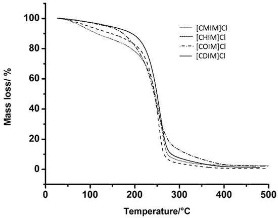 To study the thermal stability of the different ILs presented here, thermal analyses were undertaken in an interval of 20–700 °C. The mass loss curve (TG) is presented in Figure 2. The observed thermal behavior is very similar in all ILs synthesized and their onset temperature (Tonset/°C: Degradation start temperature) was very low (Table 1). Moreover, an increase in thermal stability was observed as the carbon chain length grew, being [CDIM]Cl the most stable at Tonset/°C of 106 °C, and [CMIM]Cl the least stable.