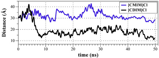 Distances between ILs [CDIM]Cl (black) and [CMIM]Cl (blue) and membrane center of masses (COMs) as a function of simulation time.