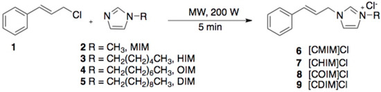 Conventional methods of ILs construction by heating generally involve several hours of reaction, high-energy consumption, and require a large excess of organic solvents. Motivated by safe and eco-friendly protocols to obtain the ionic liquids, here we report on the construction of different N-cinnamylimidazolium salts employing microwave (MW) radiation under a solvent-free condition as a Green chemistry approach. In this sense, the construction of N-cinnamylmidazolium salts with different alkyl size chains (1, 6, 8, and 10 carbon atoms) was synthesized by reacting cinnamyl chloride with different alkylimidazoles (MIM, HIM, OIM, and DIM) (Scheme 1). Resulting ILs were then cooled to room temperature and their solubility was tested in EtOAc, MeOH, and H2O. N-cinnamylimidazolium salts were soluble in MeOH and H2O; thereupon, they were rinsed with EtOAc to remove the starting reagents, and finally concentrated under high vacuum to afford [CMIM]Cl (6), [CHIM]Cl (7), [COIM]Cl (8), and [CDIM]Cl (9).