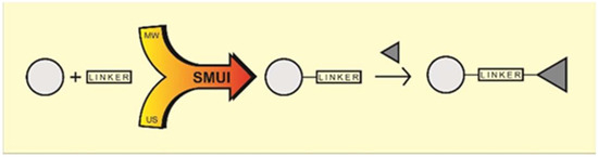 - Synergism by synthesis process intensification by means of combining two non-conventional factors: microwaves and ultrasound. These two effects of process intensification have been used to great effect in various chemical processes and engineering applications. Microwaves and ultrasounds are significantly different in terms of their nature; however, simultaneously used, they form the green SMUI technology (Simultaneous Microwave and Ultrasound Irradiation), allowing significant optimization of the chemical reaction parameters. The combination of microwaves and ultrasound has become a real chance for effective, economical and, above all, green synthetic procedures [11,12,13,14,15]. The favorable results are due to the combination of the phenomena of both factors—unique microwave heating and the phenomenon of cavitation. The microwave medium is usually combined with effective heating, and the sonification factor with efficient temperature stimulation of the chemical process. Thanks to the use of effective microwave heating, there is no loss of energy associated with conventional heating and thermal pollution of the environment is avoided. Acoustic cavitation allows thorough mixing of substrates, including two-phase mixtures, limiting the use of surfactants that have a negative impact on the environment. Thanks to cavitation, it is possible to increase the contact between the liquid substrate and the low solubility due to its fragmentation, which has a positive effect on the reaction results [11,12,13,14,15].