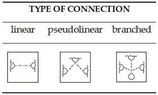 The reactions performed with selected monophenols allowed development of a general procedure for the reaction of linker insertion. However, the use of appropriate diphenols and then triphenols was not accidental, because the functionalization of these molecules using a suitably designed connector makes them potential central molecules, the so-called cores, which can be used in further research for the construction of higher molecular compounds of a certain structure, e.g., linear (derivatives of 1,4-dihydroxybenzene), pseudolinear (derivatives of 1,3-dihydroxybenzene) or branched in the case of trifunctional compounds (trihydroxybenzene derivatives), as schematically depicted in Figure 4.