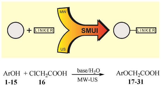 The results of the experiments performed confirmed the beneficial effect of non-classical reaction conditions. The reactions assisted with ultrasound, microwaves and above all their combination are characterized by a unique and specific synergy of action. In this study, we analyzed the reactions of O-alkylation of selected mono-, di- and triphenols with chloroacetic acid that can be used for rapid and clean functionalization or for introducing changes in the reactivity of selected active structures, not only of phenol type. The choice of the reaction will depend on the type of active structure chosen and the chemical nature of the linker introduced to it. Microwave-ultrasonic-assisted processes can successfully compete with classical synthesis methods. Results of our study confirm the literature described tendency of growing effectiveness of reaction assistance in the sequence: US, MW, MW-US. All reactions were carried out in an aquatic environment under the influence of green initiating agents, and so had no negative impact on the environment. Phenoxyacetic acid derivatives with at least one reactive carboxyl group were obtained. The obtained functionalized ether derivatives of selected phenols can be successfully used in further transformations with other active molecules in accordance with the currently applicable hybrid strategy. The use of a rational, green and synergistic synthetic approach in obtaining new ingredients for applications in the pharmaceutical field is very promising area that perfectly fits in the actual trends in medical chemistry.
