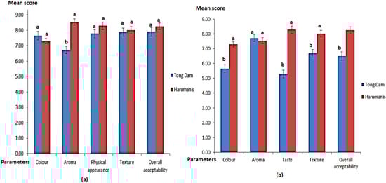 Acceptance test of the parameters for (a) whole Harumanis and Tong Dam samples and (b) slices of Harumanis and Tong Dam samples, evaluated using a 9-point hedonic sensory evaluation. Different letters indicate significant differences of mean concentrations (p ≤ 0.05) between the two mango cultivars.