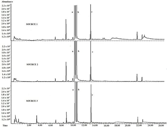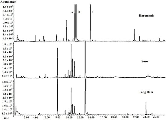 Chromatograms of Harumanis, Susu, and Tong Dam mangoes with three chemical compounds appearing in Harumanis: (a) beta-ocimene, (b) trans-beta ocimene and (c) allo-ocimene.