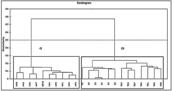 The dendrogram (Figure 5) visibly showed that all samples were divided into two major clusters, suggesting that the samples in different clusters have significant difference [17]. As expected, all the authentic Harumanis mangoes were grouped in Cluster I suggesting that all the samples contained high similarity of the VOCs. In Cluster I, there were three different mini clusters which corresponded to different sources of Harumanis. Saim et al. [18] stated that the mini clusters in the main cluster showed only slight differences but higher similarities, as compared with main different clusters. In addition, the dendogram showed that the unauthentic Harumanis mangoes were in a different cluster than the real Harumanis, confirming that both authentic and unauthentic Harumanis had high chemical dissimilarity. On the other hand, below 0.5 dissimilarity, both Tong Dam and Susu mangoes were grouped in the same cluster (Cluster II).