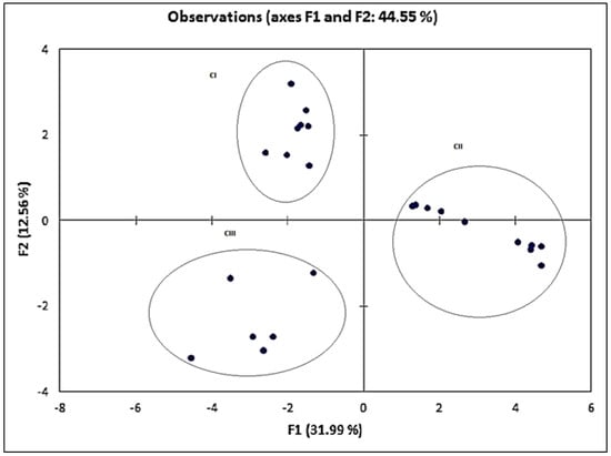 Figure 6 shows that all the three mango varieties were distinctively separated. The first two factors at 31.99% and 12.56% of variation were selected to provide the highest variation of data for convenient visualization and differentiation. The result suggested that each mango variety had their own unique chemical compositions [20]. The results presented by the PCA also indicated that there was a greater dispersion among the samples of Harumanis mango, which was consistent with the dendrogram in CA and can be explained by the higher quantity of compounds detected in smaller concentrations. The samples of the unauthentic Harumanis presented a higher clustering tendency and were located closely and in the same vertical axis. In addition, the agreement between CA and DA is consistent with this idea.