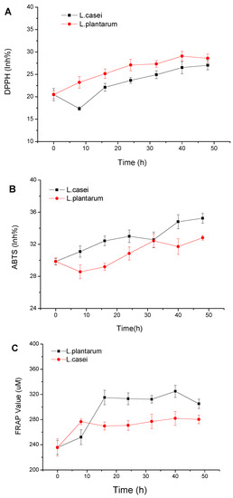 Liu, Y.; Chen, H.; Chen, W.; Zhong, Q.; Zhang, G.; Chen, W. Beneficial Effects of Tomato Juice Fermented by Lactobacillus Plantarum and Lactobacillus Casei: Antioxidation, Antimicrobial Effect, and Volatile Profiles. Molecules 2018, 23, 2366. https://doi.org/10.3390/molecules23092366