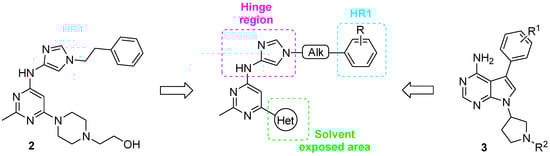 As widely reported in the literature, kinase inhibitors usually have heteroaromatic scaffolds capable of interacting with the hinge region [8]. Therefore, the synthesis of new hinge interacting moieties is crucial to obtain new molecules that may be selective for one or a few kinases and endowed with a high inhibitory potency.
