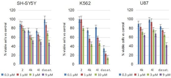 Antiproliferative effect of 4k and 4l evaluated by in vitro analysis of percentage of viable cells after 72 h of incubation with SH-SY5Y, K562, and U87 cells. Dasatinib was used as reference compound. Antiproliferative activity of compound 2 in SH-SY5Y and K562 cells has been also reported. Percentage was calculated respect to the number of cells treated with the vehicle (100%, bar not shown in the graph).