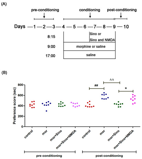 Sinomenine inhibited morphine-induced conditioned place preference in mice. (A) Schematic protocol of the conditioned place preference testing; (B) The time spent in the white compartment in preconditioning and postconditioning phases (n = 8). ## p < 0.01 vs. control, ΔΔ p < 0.01 vs. mor, * p < 0.05 vs. mor + Sino. Mor, morphine; Sino, sinomenine; NMDA, n-methyl-d-aspartate.