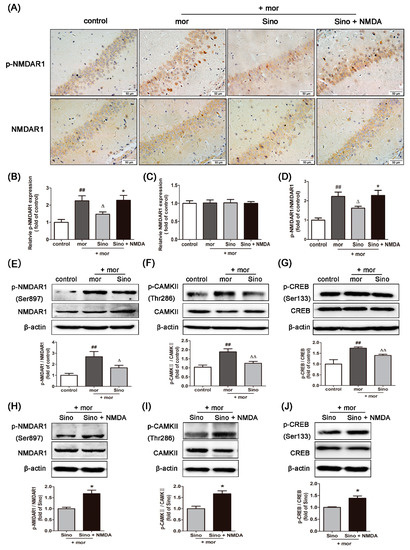 Sinomenine inhibited the expressions of p-NMDAR1/NMDAR1, p-CAMKII/CAMKII, and p-CREB/CREB in the hippocampus of morphine-dependent mice. (A–D) Immunohistochemistry analysis was used to quantify the expression levels of p-NMDAR1 and NMDAR1 in the hippocampus of morphine-dependent mice (n = 3); (E–J) Western blotting analysis was used to quantify the expression levels of p-NMDAR1/NMDAR1, p-CAMKII/CAMKII, and p-CREB/CREB in the hippocampus (n = 3). ## p < 0.01 vs. control; Δ p < 0.05, ΔΔ p < 0.01 vs. mor; * p < 0.05 vs. Sino.