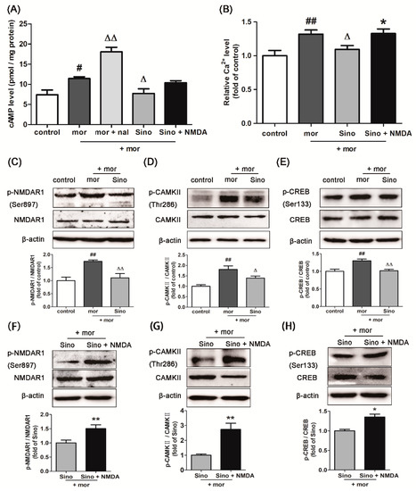 Intervention of sinomenine on morphine-treated SH-SY5Y cells. (A) Sinomenine decreased the level of cAMP in the morphine-treated SH-SY5Y cells (n = 3). SH-SY5Y cells were pretreated with 100 μMsinomenine for 12 h and then incubated with 100 μM morphine for 48 h. NMDAR agonist was incubated with SH-SY5Y cells treated with morphine and sinomenine for 12 h. Naloxone was incubated with SH-SY5Y cells treated with morphine to allow withdrawal for 20 min before evaluation. mor: morphine; nal: naloxone; (B) Sinomenine decreased the level of intracellular Ca2+ in the morphine-treated SH-SY5Y cells (n = 3); (C–E) Sinomenine suppressed the expression of p-NMDAR1/NMDAR1, p-CAMKII/CAMKII, and p-CREB/CREB, as detected by Western blotting in the morphine-treated SH-SY5Y cells (n = 3); (F–H) NMDAR agonist reversed the inhibitory effect of sinomenine on p-NMDAR1/NMDAR1, p-CAMKII/CAMKII, and p-CREB/CREB (n = 3). # p < 0.05, ## p < 0.01 vs. control; Δ p < 0.05, ΔΔ p < 0.01 vs. morphine; * p < 0.05, ** p < 0.01 vs. Sino.