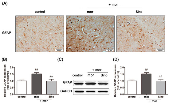 As shown in Figure 4A,B, compared with that in the control group, the expression of GFAP in the hippocampus of morphine-dependent mice was significantly higher, indicating the activation of astrocytes (Figure 4A,B, p < 0.01). Pretreatment of sinomenine significantly decreased the expression of GFAP compared with the morphine group (p < 0.01). A consistent result was observed in cultured primary astrocytes. Morphine treatment for 48 h (100 μM, Figure S2C in the Supplementary Materials) significantly increased the expression of GFAP in cultured primary astrocytes. Pretreatment with sinomenine (200 μM, see Figure S2D in the Supplementary Materials) significantly inhibited the expression of GFAP in primary astrocytes treated with morphine relative to the expression in the morphine group (Figure 4C,D, p < 0.01).