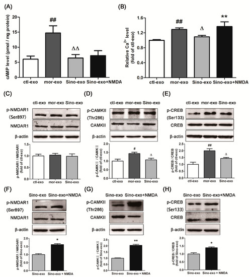 After SH-SY5Y cells were treated with 100 μM morphine for 24 h, 3 g/mL exosomes secreted by cultured primary astrocyte cells (ctl-exo), morphine-treated (mor-exo), or morphine + sinomenine-treated astrocyte cells (Sino-exo) were added to the cells, which were further incubated with 100 μM morphine for 24 h. The level of cAMP was determined. As shown in Figure 6A, the level of cAMP in the mor-exo group was significantly higher than that in the ctl-exo group (p < 0.01). This result indicated that astrocyte-derived exosomes with chronic morphine treatment could further increase cAMP levels in morphine-treated SH-SY5Y cells. Compared to that in the mor-exo group, the level of cAMP in the Sino-exo group was significantly lower (p < 0.01). The cAMP level was upregulated upon treatment with Sino-exo and the NMDA receptor agonist, but this level was not significantly different from that in the Sino-exo group (p > 0.05).