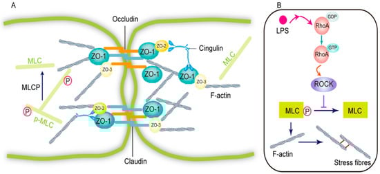Tight junctions at the brain microvascular endothelial cells [1,2] and the mechanism associated with LPS increases the paracellular permeability [10,11,12]. (A) Tight junctions comprise transmembrane proteins (claudins and occludin), cytoplasmic attachment proteins (ZO-1, ZO-2, ZO-3), and cytoskeleton protein F-actin. (B) LPS stimulation of RhoA results in activation of ROCK. ROCK phosphorylates and inactivates myosin light chain phosphatase (MLCP), leading to myosin light chain (MLC) phosphorylation and activation, which further results in actin polymerization and F-actin stress fibers formation. Finally, cell contraction induces increased paracellular permeability.