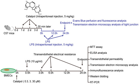 The study design of catalpol suppresses LPS-induced disruption of BMECs tight junction in vivo (top) and in vitro (bottom). BMECs, brain microvascular endothelial cells.