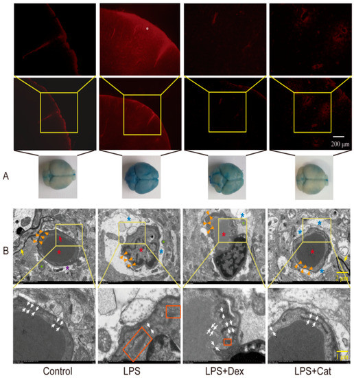 Mice in LPS + Cat group were given intraperitoneal injection of 5 mg/kg catalpol, once a day for three days. After that, mice in all groups except Control were weighed and given a series intraperitoneal injections of 5 mg/kg LPS dissolved in sterile normal saline at 0, 12, 24 h. Dex group mice were given 40 μg/kg dexamethasone 30 min after the first dose of LPS. 4 h after the last dose of LPS, 3 mice in each group were intracardially perfused with prewarmed 0.9% NaCl briefly to wash out blood cells, followed by 0.5% Evans Blue in cold 4% PFA. After perfusion, the brain was taken out, post-fixed in 4% PFA at 4 °C for 4 h, and then cryoprotected in 20 and 30% sucrose solutions in PBS at 4 °C for 3 days. The brain tissues were cut 30 μm in thickness in a cryostat (Leica Microsystems, Wetzlar, Germany). Sections were mounted on gel-coated slides, dried at 37 °C for 1 h, and kept at −20 °C for use. The Evans Blue-perfused cerebral microvessels in the sections, which exhibit fluorescence when the Evans Blue binds to proteins, were examined and imaged using a Leica fluorescence microscope equipped with a CCD camera (Leica Microsystems).