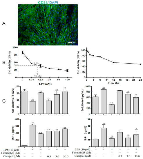 CD31 is one of the specific markers for vascular endothelial cells, and it can be utilized to identify cell origin and purity. As shown in Figure 4A, BMEC cells, purified in the current study, were labeled with fluorescent-tagged CD31, green color, and 98% purity was found, rendering them eligible for subsequent experiments (Figure 4A). After 24 h of stimulation with LPS, the growth of BMECs was inhibited in a concentration-dependent manner, with an approximate LC50 value of 10 µg/mL (Figure 4B). Therefore, 10 µg/mL LPS was selected for establishing the BMEC damage model (this concentration significantly inhibited the BMEC cell survival rate, while not severely damaging the cells, thus allowing an adequate number of cells to be collected for subsequent experiments). The optimal intervention time required for LPS to establish a BMEC damage model was estimated according to the determined LPS concentration. As shown in Figure 1B, LPS inhibited the cell growth in a time-dependent manner, and only 50% of the cells survived the 24-h time point. Therefore, in this study, the BMEC damage model was established utilizing 10 µg/mL LPS for 24 h.