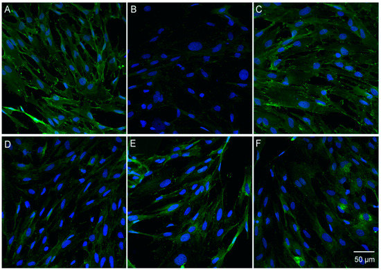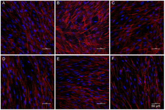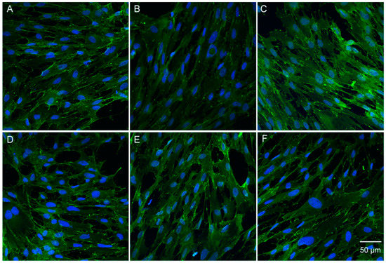 The effects of catalpol on F-actin polymerization induced by LPS detected by immunofluorescence staining. (A) normal group; (B) model group; (C) Fasudil group; (D) catalpol 0.3 μM group; (E) catalpol 3.0 μM group; (F) catalpol 30.0 μM group.