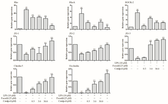 The effects of catalpol on the changes of tight junction and Rho/ROCK pathway mRNA level induced by LPS detected by qPCR (±SD, n = 3). ## p < 0.01 vs. the control group; ** p < 0.01, vs. the LPS group.