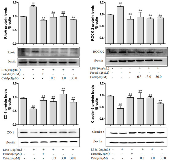 Moreover, only a significant increase in the mRNA levels in Rho, RhoA, and ROCK2 was observed (p < 0.01, Figure 9). The prophylactic protection with catalpol or fasudil led to a marked reversion of the above changes in the mRNA levels (p < 0.01, Figure 9). Western blotting (WB) detection also demonstrated a significant reduction in the protein levels of ZO-1 and claudin-5 after LPS trauma in BMECs and a significant increase in the protein levels of RhoA and ROCK-2 (p < 0.01, Figure 10). The prophylactic protection with catalpol or fasudil led to a marked reversion of the above changes in the protein levels (p < 0.01, Figure 10).