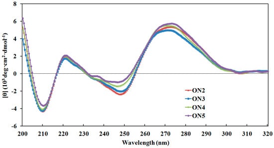 The circular dichroism (CD) spectra of duplexes formed by the modified oligonucleotides ON2–ON5 with RNA complements. Spectra were recorded three times independently at 20 °C after annealing the duplexes under the same condition described in ultraviolet (UV) melting experiments.