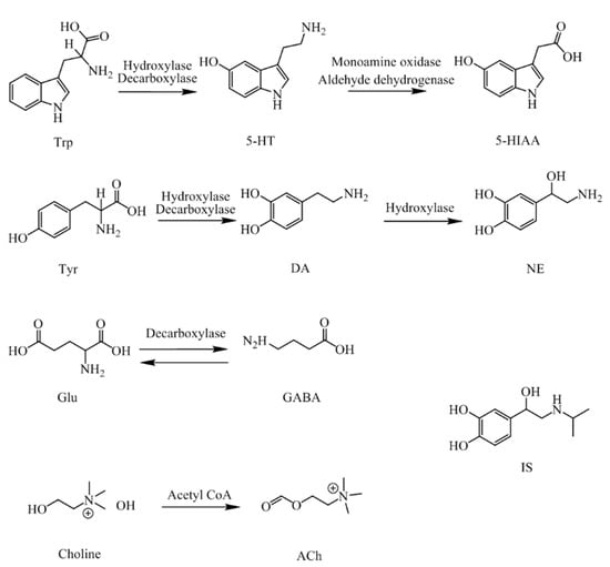 NTs and their metabolites are exist extensively in CNS and the peripheral biofluids of mammals [13,14], including neurotransmitters of amino acid, such as Trp, Tyr, ACh, Glu and GABA, and monoamine neurotransmitters, such as 5-HT, DA, and NE, and also their acidic metabolite 5-HIAA. Their molecular structures and pathways are presented in Figure 1.