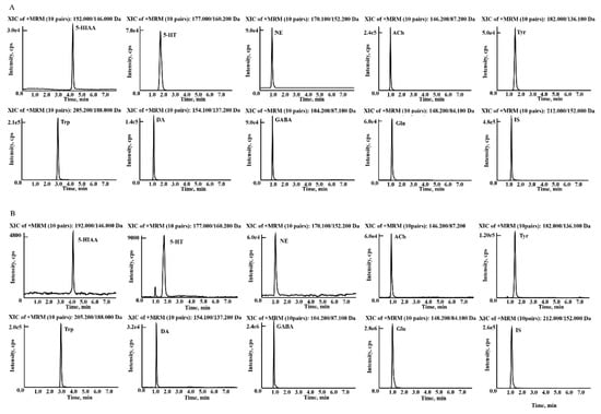 - Wei, B.; Li, Q.; Fan, R.; Su, D.; Chen, X.; Jia, Y.; Bi, K. Determination of monoamine and amino acid neurotransmitters and their metabolites in rat brain samples by UFLC-MS/MS for the study of the sedative-hypnotic effects observed during treatment with S. chinensis. J. Pharm. Biomed. Anal. 2014, 88, 416–422. [Google Scholar] [CrossRef] [PubMed]