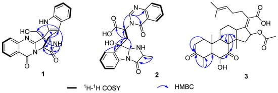Compound 2 was isolated as a white amorphous solid. Based on the HRESIMS ion peak at m/z 419.1364 [M − H]− (calcd for 419.1361), the molecular formula was established as C22H20N4O5 indicating fifteen degrees of unsaturations (Figure S18). The 1D and 2D NMR spectra (Table 1, Supplementary Materials) revealed the presence of two 1,2-disubstituted benzene rings of the gem-methyl imidazoindolone ring system and quinazolin-4(3H)-one moiety, similar to those of tryptoquivaline F [15]. Interestingly, C-3 (δC 90.9), C-11 (δC 172.2), and C-13 (δC 32.7) resonated at higher chemical shift values than their counterparts in tryptoquivaline F (δC 86.2, 170.8 and 30.7) while C-2 (δC 82.8), C-14 (δC 172.2) and C-15 (δC 58.0) exhibited lower chemical shift value than the corresponding carbon (δC 84.5, 176.8, and 59.5) of tryptoquivaline F. This implied that the five-membered spirolactone ring is opening, as is evident from the molecular formula of compound 2 (C21H16N4O3). Based on the chemical shift value of H-12 (δH 5.50, t, J = 14.0), the configuration of C-12 was the same as that of tryptoquivaline F [15,16]. The HMBC correlations shown in Figure 2 were used to construct the planar structure of 2. In the nuclear overhauser effect spectroscopy (NOESY) spectrum of 2, H-2 showed NOE with H-15, but not with H3-27, exhibited different correlations to those observed for tryptoquivalines L and H. The absolute configuration of compound 2 remains to be established.