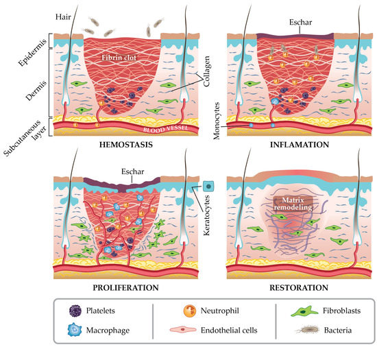 A wound can represent a simple or a severe disorder to an organ (such as the skin) or a tissue and can spread to other tissues and anatomical structures (e.g., subcutaneous tissue, muscles, tendons, nerves, vessels, and even to the bone) [1]. Among all human body (HB) organs, the skin is without doubt the most exposed to impairment and injury, scratches, and burns. By damaging the epithelium and connective structures, the HB’s capability to provide protection from the outer environment is weakened. It is therefore imperative to refabricate a functional epidermis or even other layers of skin. This happens by a cascade of intersecting phases, known as wound healing or wound repair. The repair is reached by the HB’s capacity to substitute lost skin structure with a viable one, and by the formation of a scar.