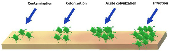 As soon as the skin is impaired, typical microorganisms of the normal skin flora and exogenous bacteria and fungi can soon gain access to underlying tissues, which offers a humid, warm and nutrient rich environment [41] for their development. However, when the healing is delayed, the normal microbiota of the wound changes and more aggressive microbial types are hosted [42]. Therefore, an open wound can be a favorable place for microbial proliferation and colonization. In the initial phases of chronic wound construction, Gram-positive entities, mostly S. aureus, appear the most. In advanced phases, Gram-negative species (e.g., Escherichia coli and Pseudomonas sp.) are mostly present and are likely to enter the deeper skin layers, significantly affecting tissues. Additionally, cocci types are present in ~50% of chronic wounds [5]. An infection at a wound site starts with contamination, and continues with (acute) colonization and wound infection (as represented in Figure 2).