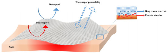 When in contact with the wound, the dressings must provide a moist environment while absorbing wound fluids [69,70,71], and maintain appropriate tissue temperature to improve the blood flow to the wound [72]. The dressings must be biocompatible [73], semi-permeable to water and oxygen [74], promoting tissue renewal processes, hypoallergenic while not provoking immune responses [72] (Figure 3). Furthermore, the dressing must not produce traumas when removed and must also be cost effective. One may conclude that due to diverse features of each wound, including healing stages, there is no dressing that can be appropriate in all circumstances. Nevertheless, many research teams fabricated and improved different wound dressing materials that fit the most of needs for particular wound phases [75].