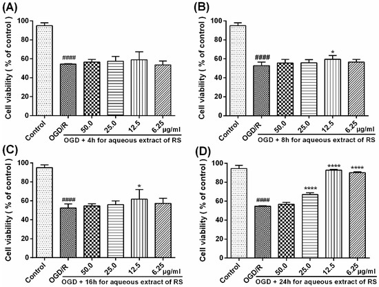 Effects of Radix Scrophulariae aqueous extract on the viability of PC12 cells after OGD/R. After PC12 cells were exposed to 2 h of OGD following 24 h of reperfusion, cell viability was significantly decreased. (A) Incubation of PC12 cells with different concentrations of RSAE (5.0, 12.5, 25.0 and 50.0 μg/mL) alone for 4 h did not affect cell viability. (B,C) Pretreatment with RSAE (12.5 μg/mL) for 8 h and 16 h significantly improved cell viability. (D) After PC12 cells were exposed to 2 h of OGD following 24 h of reperfusion, pretreatment with RSAE (5.0, 12.5, 25.0 and 50.0 μg/mL) for 24 h significantly improved cell viability. Mean values ± standard error of the mean (n = 6); * p < 0.05, **** p < 0.00001 versus OGD/R group; # p < 0.05, ## p < 0.01, #### p < 0.0001 versus control group.