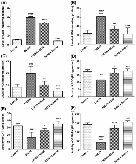 Compared with control group, OGD/R treatment markedly increased the concentrations of MDA from 25.84 ± 7.09 to 64.81 ± 2.23 and those of NO from 8.36 ± 2.75 to 19.79 ± 6.71 (p < 0.001, Figure 3B,C). However, 12.5 μg/mL RSAE inhibited OGD/R-induced damage and decreased the concentrations of MDA and NO to 34.24 ± 8.36 and 10.24 ± 3.52, respectively (p < 0.001, Figure 3B,C).