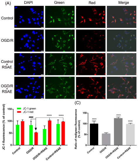 The change in the mitochondrial membrane potential (MMP) was detected by JC-1 staining [36]. PC12 cells (cell density, 1 × 105 cells/mL) were cultured in 24-well plates. Posttreatment, cells were harvested and incubated with JC-1 (2 mM final concentration) at 37 °C in the dark for 30 min. Then, the cells were immediately observed using fluorescence microscopy (Leica, Germany Q9). The results were analysed using the ImageJ software (National Institutes of Health, Bethesda, MD, USA) [33]. The following four sets of experiments were performed: (1) control PC12 cells, (2) OGD/R induced-PC12 cells, (3) cells pretreated with 12.5 μg/mL RSAE for 24 h and then induced by OGD/R, and (4) control cells pretreated with 12.5 μg/mL RSAE.