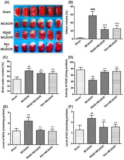 Moreover, compared with the sham operation, the MCAO/R operation obviously reduced the activity of SOD from 76.61 ± 7.67 to 44.38 ± 5.91 (p < 0.01, Figure 5D) and increased the concentration of MDA from 2.56 ± 0.47 to 4.43 ± 0.99 (p < 0.01, Figure 5E) and that of NO from 1.29 ± 0.43 to 2.37 ± 0.40 (p < 0.01, Figure 5F). However, pretreatment with RSAE inhibited the MCAO/R-induced ischemic damage and increased the activity of SOD to 69.63 ± 7.14 (p < 0.01, Figure 5D). The concentrations of MDA and NO decreased to 2.68 ± 0.27 and 1.54 ± 0.69, respectively (p < 0.01, Figure 5E,F). RSAE and nimodipine are similar in their ability to regulate the concentrations of MDA and NO and the activity of SOD (p < 0.01, Figure 5D–F, respectively).