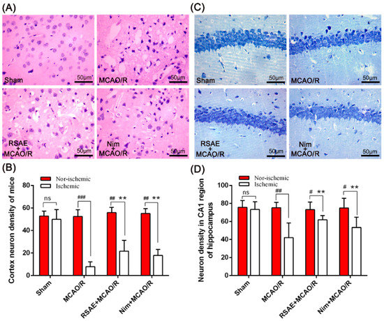 As shown in Figure 6A,C, nerve cells of the sham operation group presented a normal structural form: the cell outline was clear, the structure was compact, and the nucleolus was clearly visible, similar to the nonischemic brain tissue of the MCAO/R model group and of the RSAE-treated group.