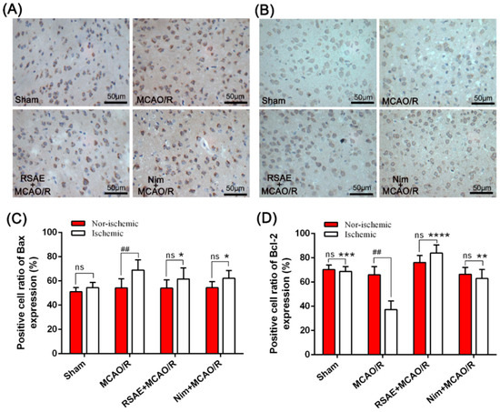 Effect of RSAE on the levels of Bax- and Bcl-2-positive cells in mice with focal cerebral ischemia at 24 h after ischemia/reperfusion. (A) Representative immunohistochemical staining images of pro-apoptotic Bax in the ischemic and nonischemic neuron sections at 24 h after ischemia/reperfusion. (B) Representative immunohistochemical staining images of anti-apoptotic Bax in the ischemic and nonischemic neuron sections at 24 h after ischemia/reperfusion. (C) Quantitative analysis of Bax-positive cells in mice with focal cerebral ischemia at 24 h after ischemia/reperfusion. (D) Quantitative analysis of Bcl-2-positive cells in mice with focal cerebral ischemia at 24 h after ischemia/reperfusion. Mean values ± standard error of the mean (n = 10); * p < 0.05, ** p < 0.01, ***** p < 0.0001 versus MCAO/R group; # p < 0.05, ## p < 0.01, #### p < 0.0001 versus sham-operated group; ns means not significant. Scale bar, 50 μm.