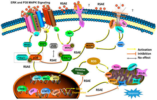 It is known that the activation of MAPKs signaling pathways plays a critical protective role against OGD/R and MCAO/R-induced apoptosis and could regulate the phosphorylation of ERK1/2 JNK1/2 and p38 MAPK to exert neuroprotective effects [8,9,10,11,13,25,26,27]. Based on the effects of RSAE on oxidative stress in OGD/R and MCAO/R models, the association between oxidative stress damage induced by OGD/R and MCAO/R models and the subsequent activation of MAPK was elucidated.