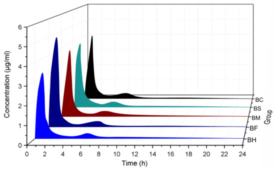 3.2. Tissue Distribution of Berberine Hydrochloride (BH) and Berberine Fumarate (BF)