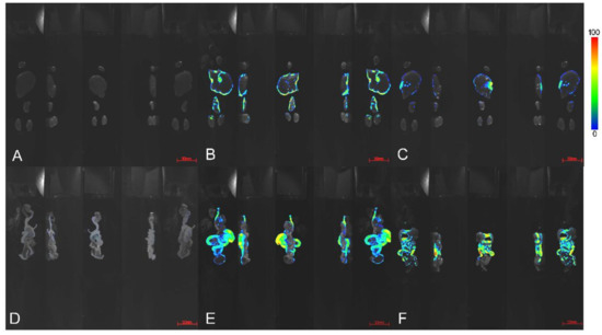 Figure 4. After 4 h of administration, the organ imaging map of nude mice. Mice were treated with intragastric administration of distilled water (A,D), 500 mg/kg berberine fumarate (BF; B,E), and berberine hydrochloride (BH; C,D). (AC) are the heart, liver, lung, and kidney of nude mice. (DF) are the intestinal tract of the nude mice, including the small intestine, cecum, and rectum. Exposure time was 5 s, central wavelength 470 nm.