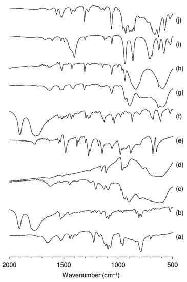 FT-IR spectra in the range of 500–2000 cm−1 of (a) 1,2,3-trz, (b) tricarbonyl complex 1, (c) oxidized derivative 1OD, (d) hybrid 3, (e) 1,2,4-trz, (f) tricarbonyl complex 2, (g) oxidized derivative 2OD, (h) hybrid 4, (i) dinuclear complex 5, and (j) trinuclear complex 6 (from ref. []).