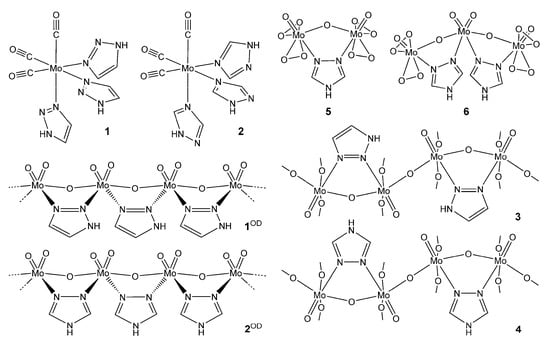 - Lysenko, A.B.; Senchyk, G.A.; Domasevitch, K.V.; Hauser, J.; Fuhrmann, D.; Kobalz, M.; Krautscheid, H.; Neves, P.; Valente, A.A.; Gonçalves, I.S. Synthesis and Structural Elucidation of Triazolylmolybdenum(VI) Oxide Hybrids and Their Behavior as Oxidation Catalysts. Inorg. Chem. 2015, 54, 8327–8338. [Google Scholar] [CrossRef]