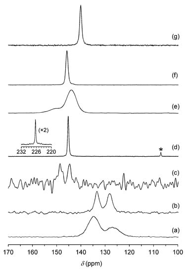 13C{1H} CP MAS NMR spectra of (a) oxidized derivative 1OD, (b) hybrid 3, (c) 1,2,4-trz, (d) complex 2, (e) oxidized derivative 2OD, (f) hybrid 4, and (g) dinuclear complex 5. The inset shows the single 13C resonance observed for the CO groups of 2 (d). The asterisk denotes a spinning sideband.