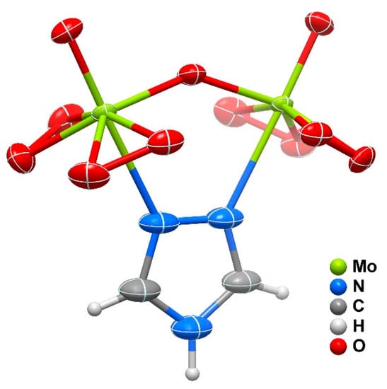 The anionic [Mo2O2(μ2-O)(O2)4(1,2,4-trz)]2− complex is built up from a single MoVI metal center which is coordinated to a μ2-bridging oxo group (also located on the mirror plane), a terminal oxo moiety, two peroxo ligands, and one nitrogen atom from a N,N-bridging triazole molecule as depicted in Figure 4.